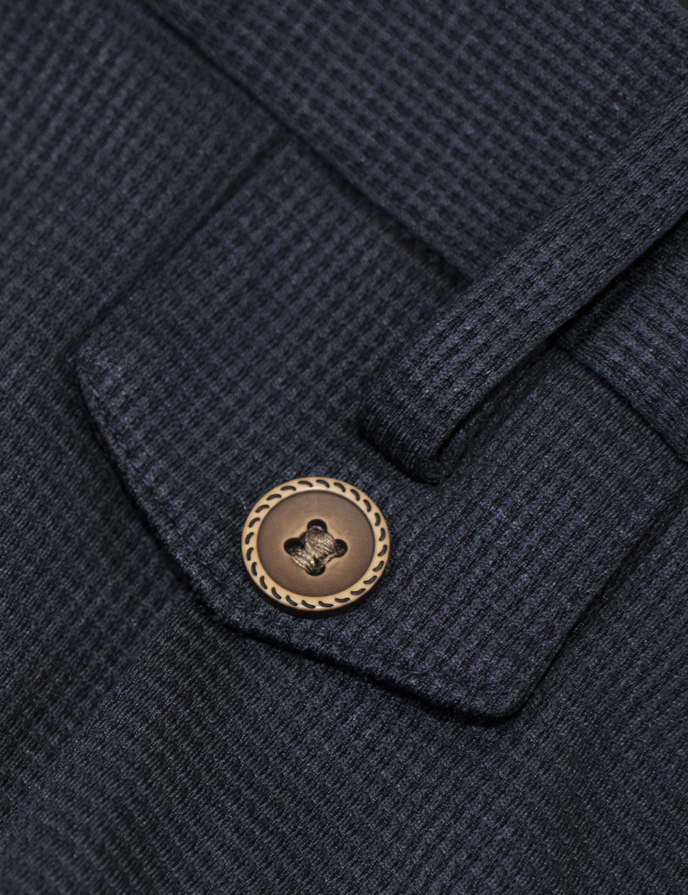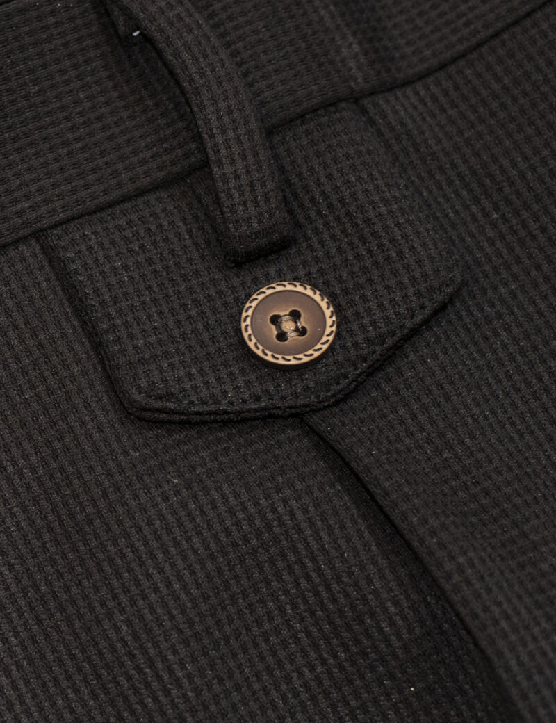 Τα κουμπιά στο σακάκι και στο παντελόνι είναι σε καφέ-κάμελ απόχρωση.